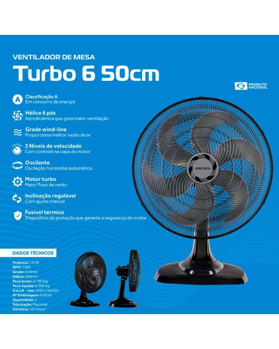 Ventilador De Mesa Turbo Premium 6p 135w 50cm 127v Ventisol