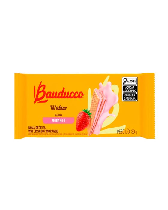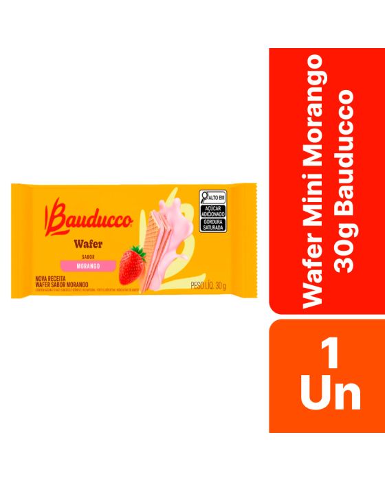 Características:Os Wafers Bauducco são os preferidos dos consumidores. Irresistivelmente crocantes e com muito recheio, eles são ideais para qualquer hora do dia!Aquele lanchinho da tarde pede o Wafer Mini Morango Bauducco, sua textura crocante, leve e com um sabor irresistível fazem com que este momento fique ainda mais perfeito e saboroso, além de ser prático e fácil armazenamento.Detalhes:- Marca: Bauducco;- Linha: Wafer;- Sabor: Morango;- Tipo: Porção individual;- Peso: 30g;- Contém: 1 unidade do produto;- Crocante, leve e saboroso;- Nova receita.Indústria Brasileira. | Validade: Impresso na embalagem do produto.Ideal para:- Ideal para o lanche da manhã ou da tarde em hospitais, clínicas de saúde, estética e odontologia, refeitórios empresariais e ambientes corporativos.Conservação:- Mantenha em local seco, fresco e inodoro;- Conservar longe da umidade;- Conservar fora do abrigo do calor, temperatura AmbienteIngrediente:- Açúcar, Gordura Vegetal, Farinha de Trigo enriquecida com ferro e ácido fólico, Amido, Óleo Vegetal, Sal, Preparado de Morango em Pó (Suco de morango, Açúcar, Farinha de Arroz, Maltodextrina, Amido, Glicose e Emuldificante: Lecitina de Girassol, Acidulante: Ácido Cítrico, Aromatizante e Corante Natural: Carmim), Emulsificantes: Lecitina de Soja e Monoestearato de Sorbitana, Aromatizante, Fermento Químico: Bicarbonato de sódio, Corante natural: Carmim e Acidulante: Ácido Cítrico.Medidas:- Dimensões da embalagem: 14,5 x 5 x 2cm (CxLxA);- Peso: 37g.ALÉRGICOS: CONTÉM DERIVADOS DE SOJA E DE TRIGO. PODE CONTER: AMENDÔAS, AMENDOIM, AVEIA, AVELÃ, CASTANHA-DE-CAJU, CASTANHA-DO-PARÁ, CENTEIO, CEVADA, GERGELIM, LEITE E OVOS.CONTÉM GLÚTEN.* As especificações podem ser alteradas sem aviso prévio ** Imagem meramente ilustrativa.