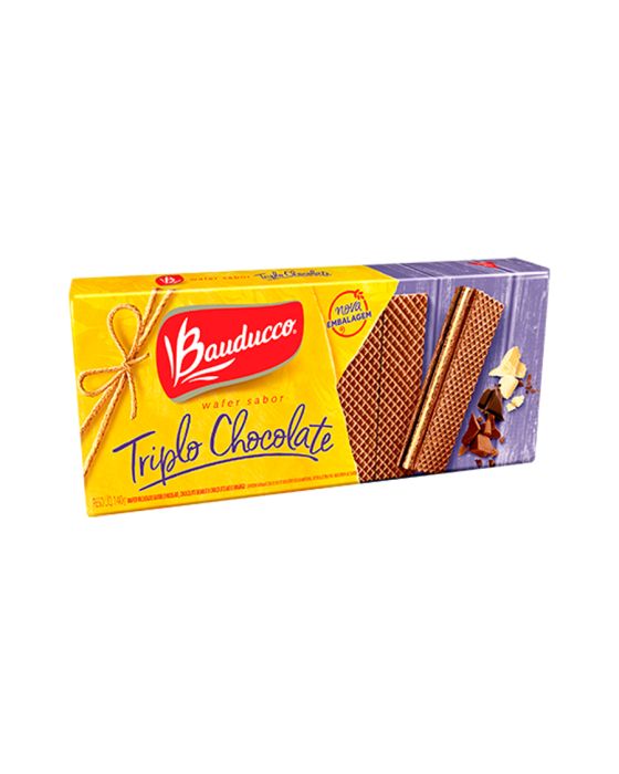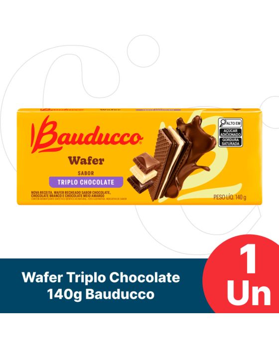 Caracteristicas:Os wafers Bauducco são os preferidos dos consumidores. irresistivelmente crocantes e com muito recheio, eles são ideais para qualquer hora do dia.- Embalagem 140g- Sabor: Triplo ChocolateIngredientes: açúcar, gordura vegetal, farinha de trigo enriquecida com ferro e ácido fólico, cacau em pó, amido, óleo de milho, manteiga de cacau, sal, emulsificante: lecitina de soja, aromatizantes e fermento químico: bicarbonato de sódio. CONTÉM GLÚTEN. ALÉRGICOS: contém derivados de trigo e de soja. pode conter: centeio, cevada, aveia, amendoim, amêndoa, avelãs, castanha-de-caju, castanha-do-pará, pistaches, gergelim, leite, nozes e ovos. a validade mencionada refere-se ao produto ainda fechado, desde que, conservado em local seco, fresco e inodoro. consumir logo após aberto.* As especificações podem ser alteradas sem aviso prévio ** Imagem meramente ilustrativa.